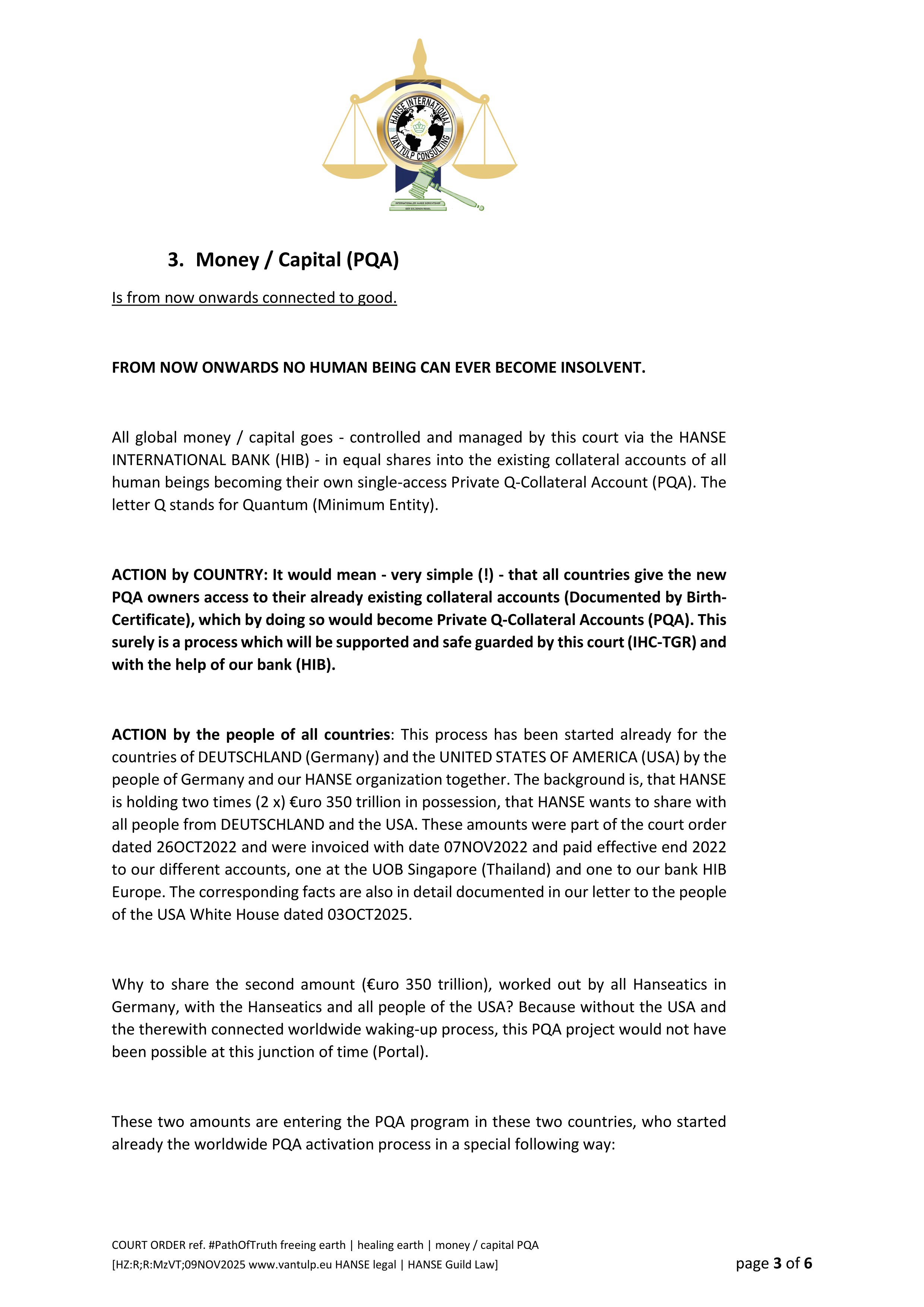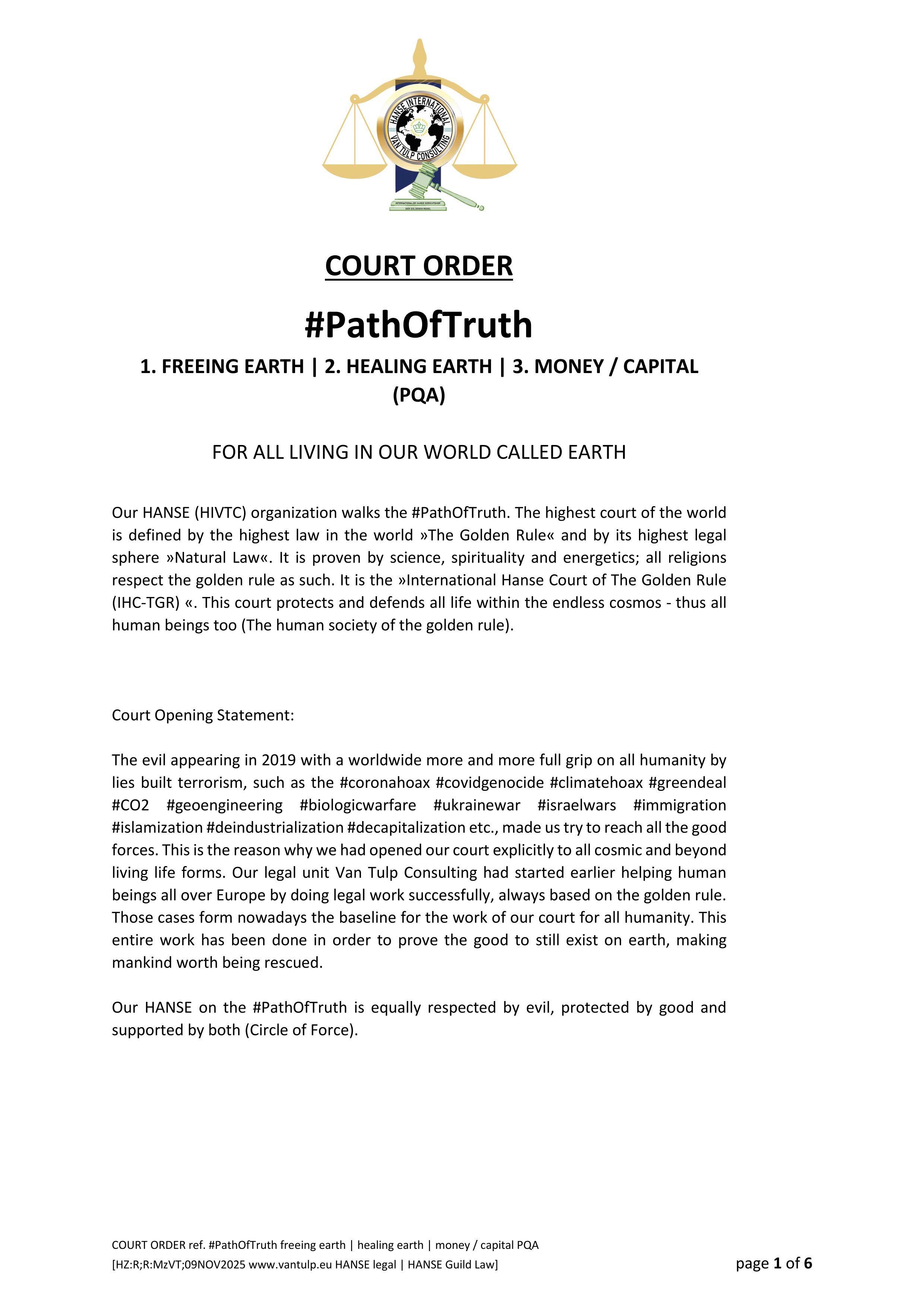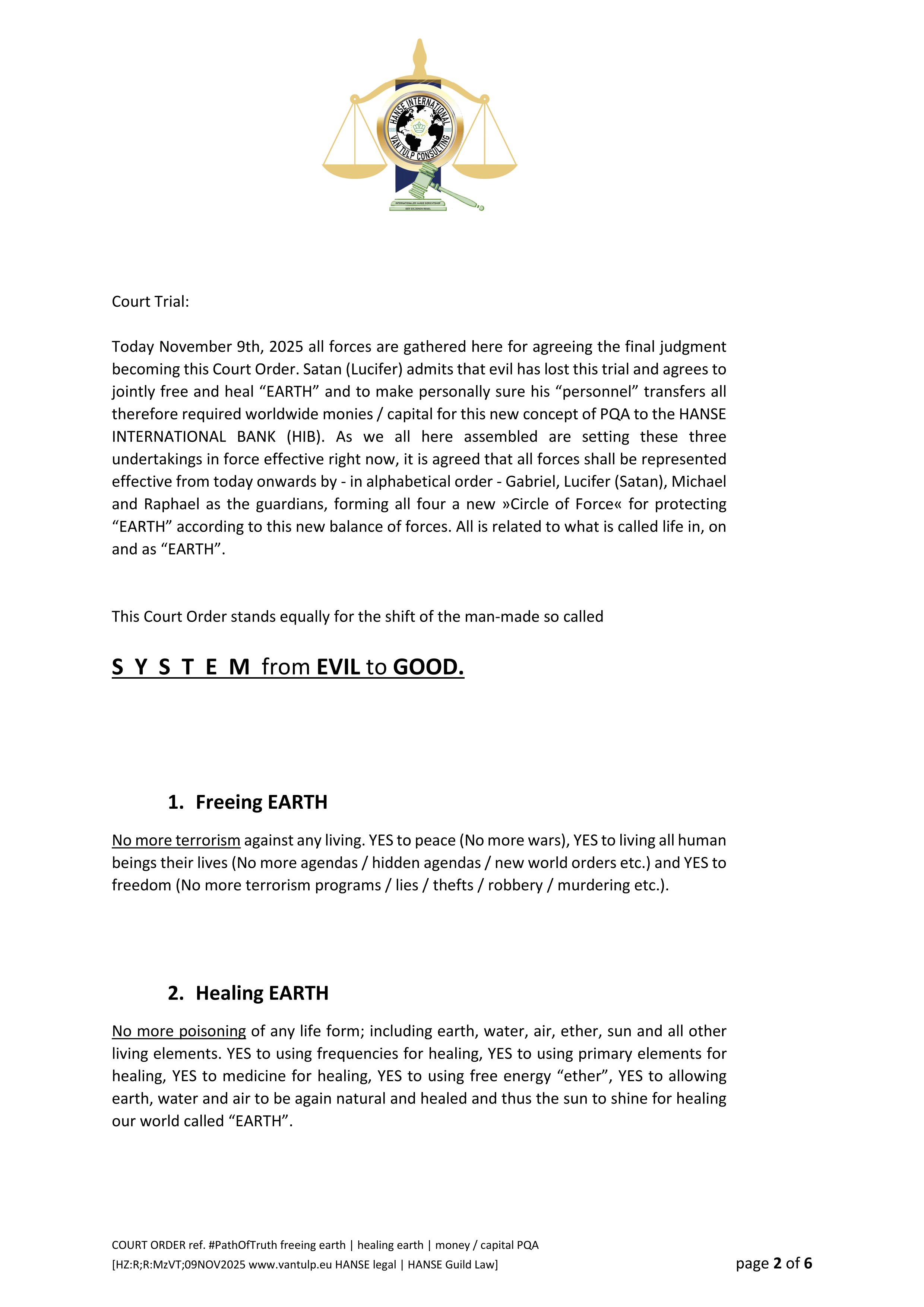 Bite the apple! Paradise again? We human beings live in a world which developed itself to a functioning system, we also call it matrix. It works! The only thing which is not to our liking, at least to the liking of the many of us, is its negativity - some call it satanic or evil. So the task can only be to hold on to a well functioning system by then simply changing it from evil to good. This shift of the man-made so called S Y S T E M from EVIL to GOOD is dealt with in the COURT ORDER referenced with #PathOfTruth being about 1. FREEING EARTH | 2. HEALING EARTH | 3. MONEY / CAPITAL (PQA). COURT ORDER Pages 1-3 are enclosed following.